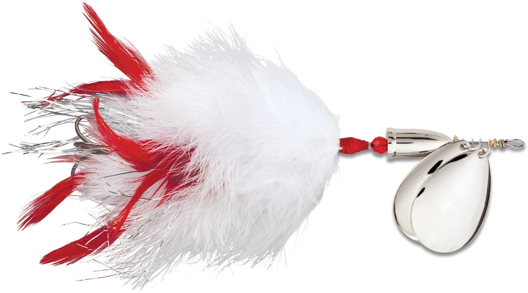 Blue Fox Vibrax Super Bou Twin Blades is a large inline spinner designed to attract muskie and withstand their fierce, toothy strikes. This lure combines marabou, hackle and flashabou fibers to create an undulating action that makes the bait look alive. This spinner is built with durable stainless steel to handle powerful muskie strikes. Equipped with premium VMC hook and durable stainless steel through wire construction. The size 8’s small sleek design is rigged with one hook and is great for burning over shallow cover. The two treble hook size 10 has a larger profile body which emulates mature bait mid-season. Available in 7 colors.