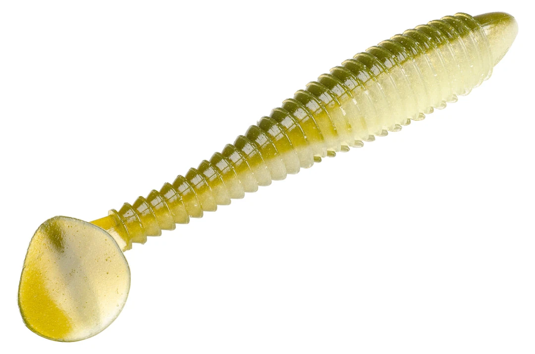 - Sleek nose cone and softly ribbed body to replicate natural baitfish contours and a pancake-like paddle tail to pump out vibrations.
